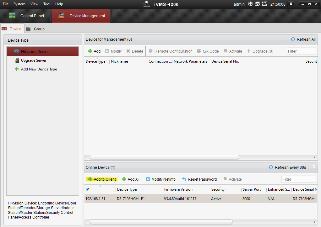 14. en la parte de abajo ONLINE DEVICE, le aparecerá su equipo automáticamente, seleccionelo y presione el boton "Add to Client"