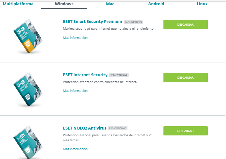 1. Ingrese a este link: https://www.eset.com/gt/descarga-productos-eset-hogar/#c2777474 en el encontrará las diferentes soluciones de HOGAR que Eset le ofrece. Identifique la solución que usted compro y el sistema operativo que su computadora posee para DESCARGAR el instalador correcto.