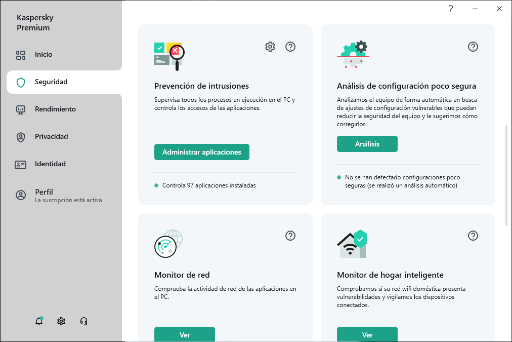Comencemos por la piedra angular de toda la operación: la seguridad. Aquí es donde encontrarás todas nuestras herramientas probadas (y, a menudo, con las mejores puntuaciones de la industria) como antivirus, cortafuegos, antiphishing, antivirus web, protección contra rootkits y ransomware, así como análisis y prevención de vulnerabilidades.