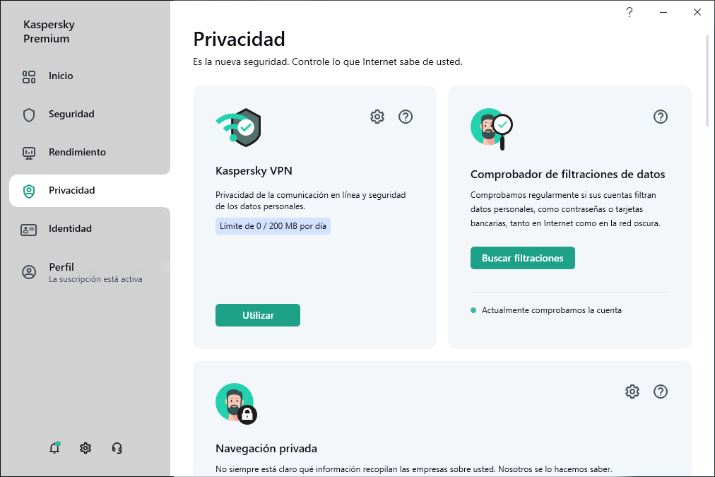 La cantidad de herramientas útiles en cada categoría depende de tu plan. Cuando cambias a un nivel superior, desbloqueas el siguiente nivel y obtienes un conjunto de funciones adicionales. Con Kaspersky Standard, obtienes seguridad y rendimiento y funciones básicas de privacidad. Cambiar a Kaspersky Plus desbloquea el resto de las funciones en la pestaña Privacidad, así como la suscripción a una VPN ilimitada. Kaspersky Premium abarca la totalidad de las funciones, incluida la pestaña Identidad.