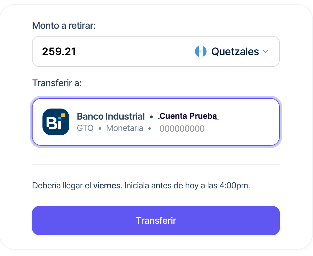 Puedes retirar ya sea tu balance en USD o GTQ. Recuerda que si no tienes una cuenta en USD ya tenemos el cambio de divisas automático.